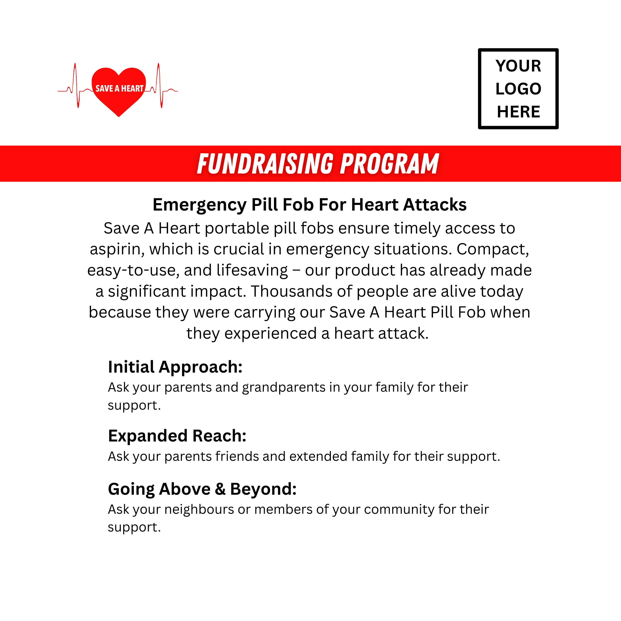 Fundraising: Purchase Save A Heart pill fobs and resell them to generate a 40-50% profit through your fundraising initiatives. It’s a meaningful and effective way to raise money while promoting heart health.